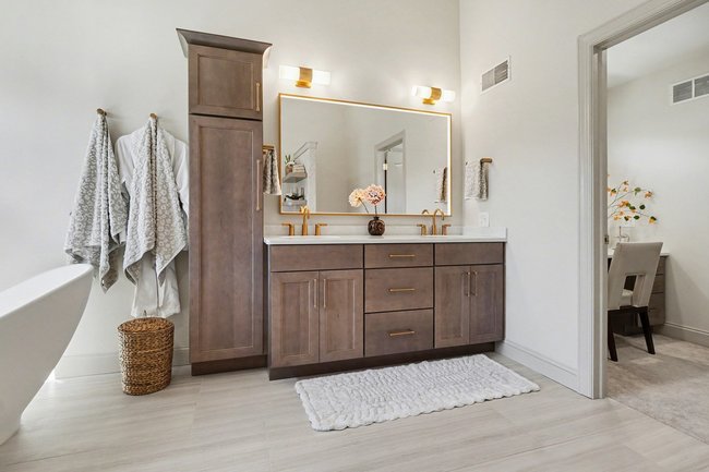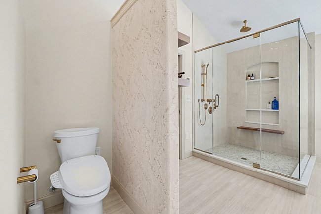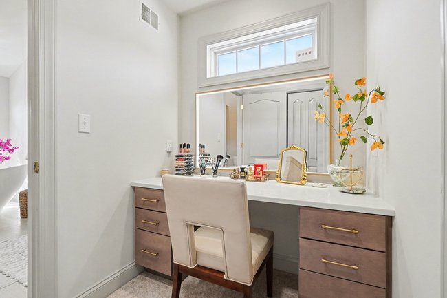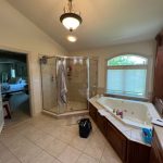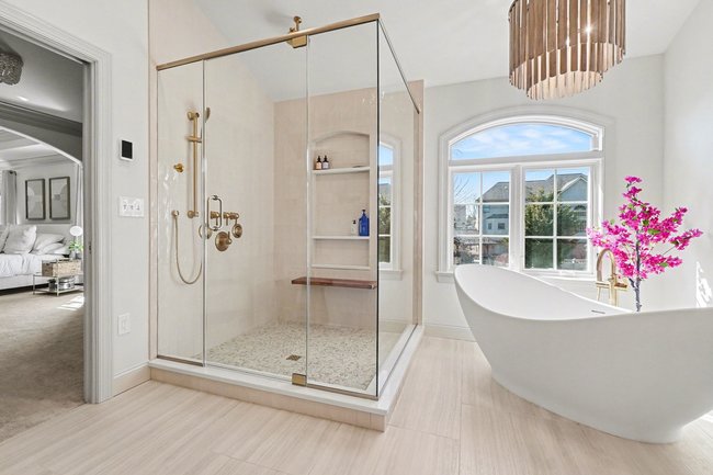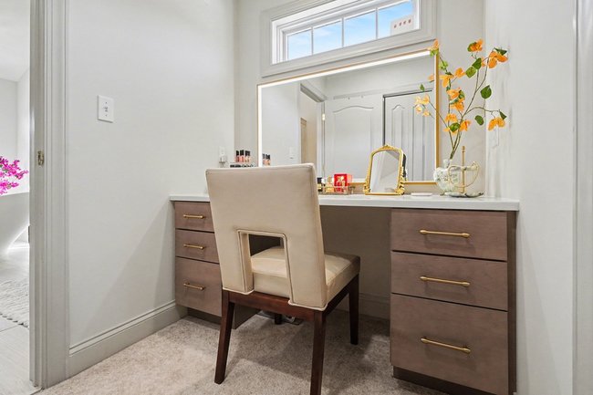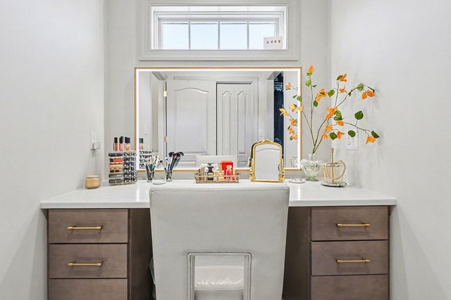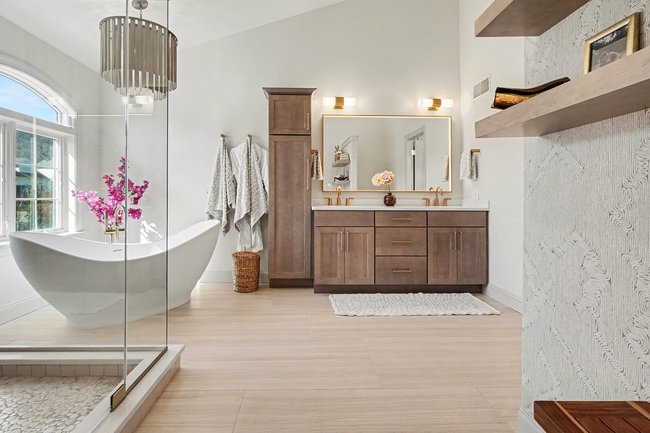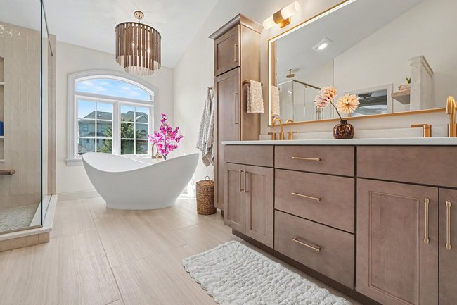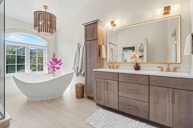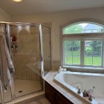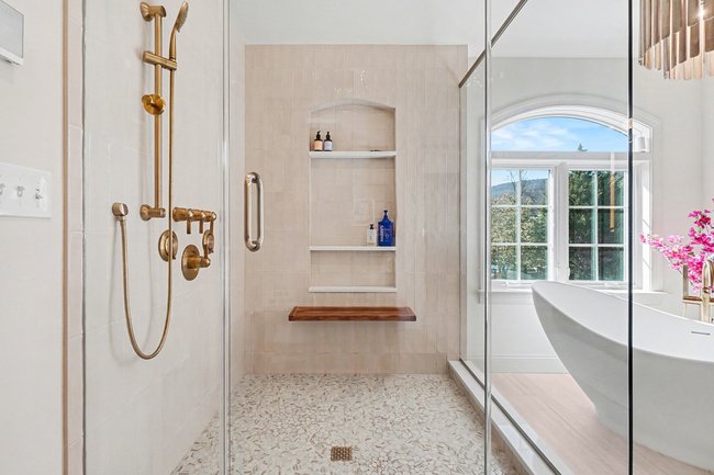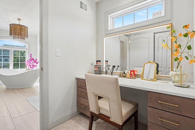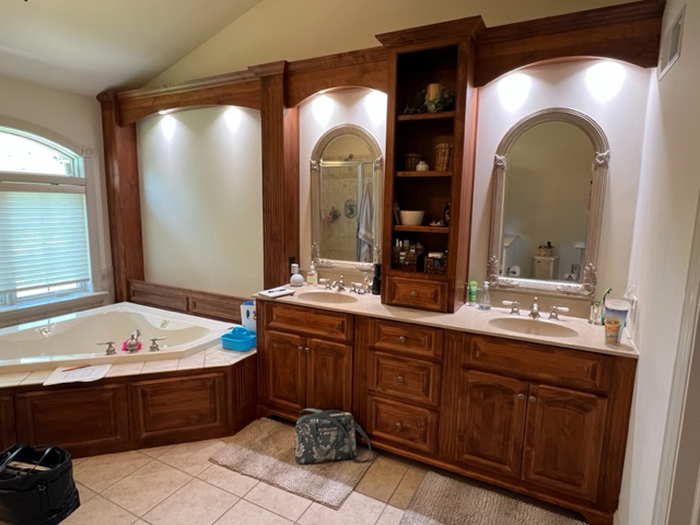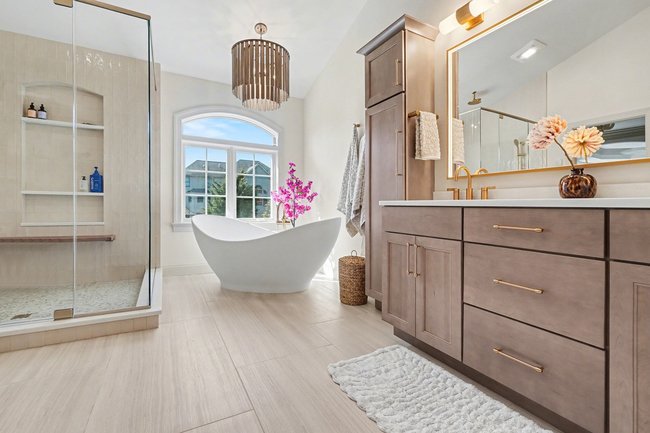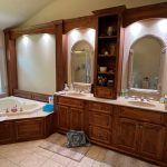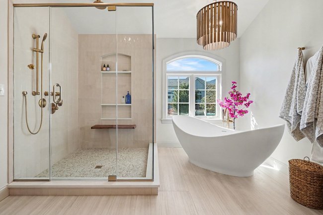 Transform your daily routine into a spa-like experience. In this Linglestown masterpiece, we replaced a dated corner tub with a sprawling custom tile shower and a sculptural Juliet Boutique pedestal air tub. No detail was overlooked, from the heated tile floors to the Moen Cia brushed gold body sprays and rain shower head. The custom makeup area is illuminated by designer lighted mirrors, while a teak floating bench adds a warm, organic touch to the shower. This is more than a bathroom; it’s a high-tech sanctuary designed for ultimate comfort and modern elegance.